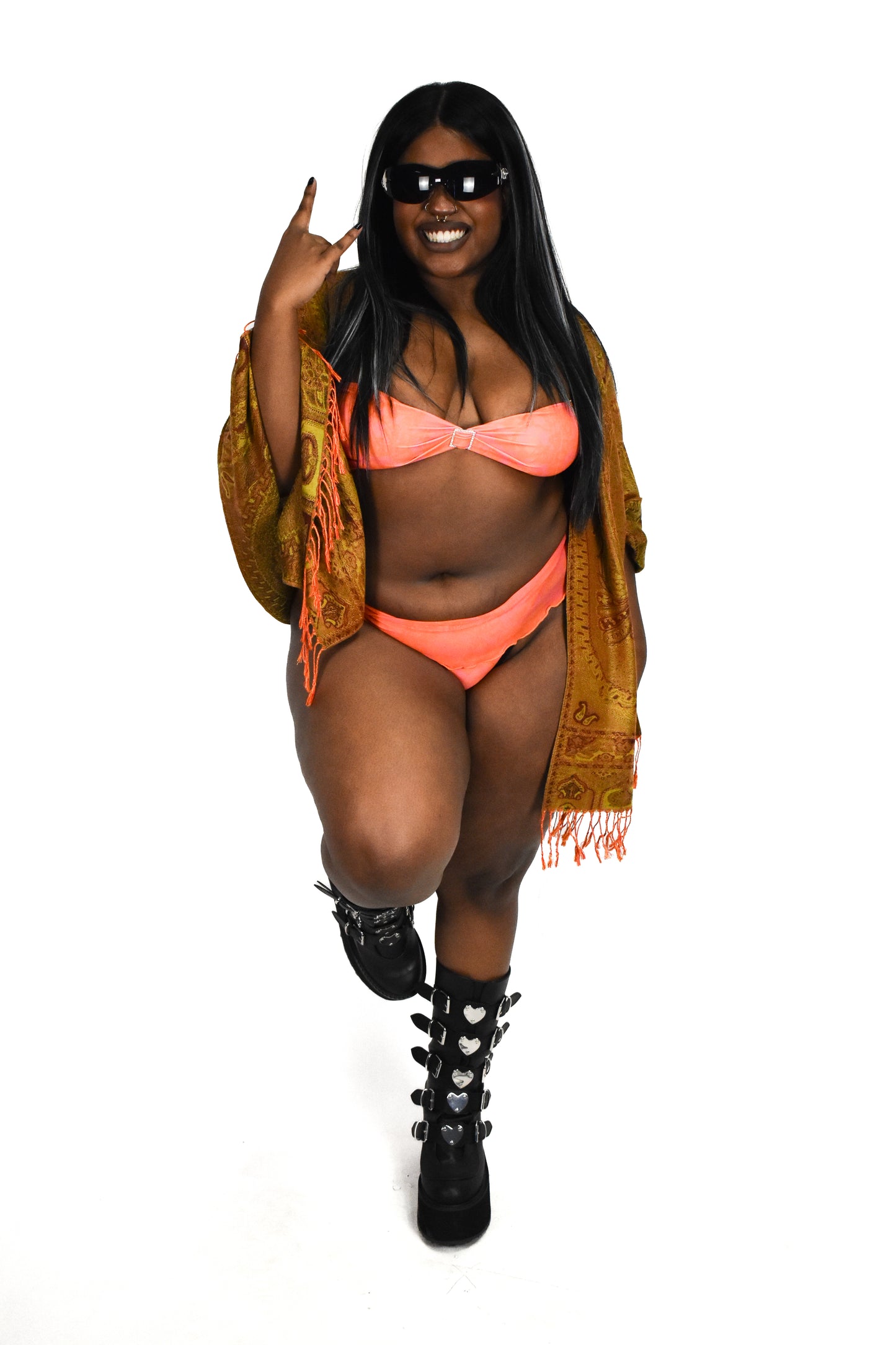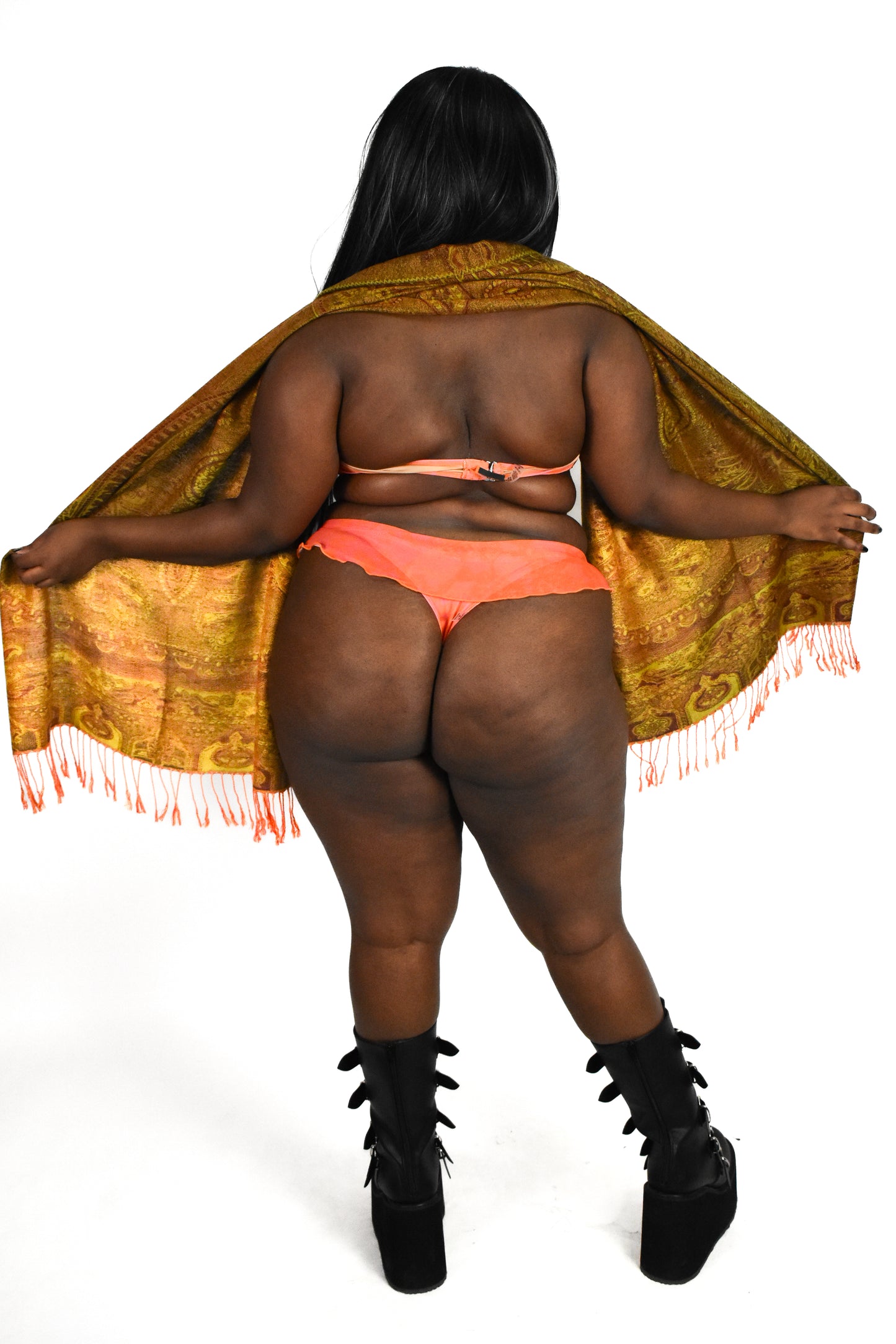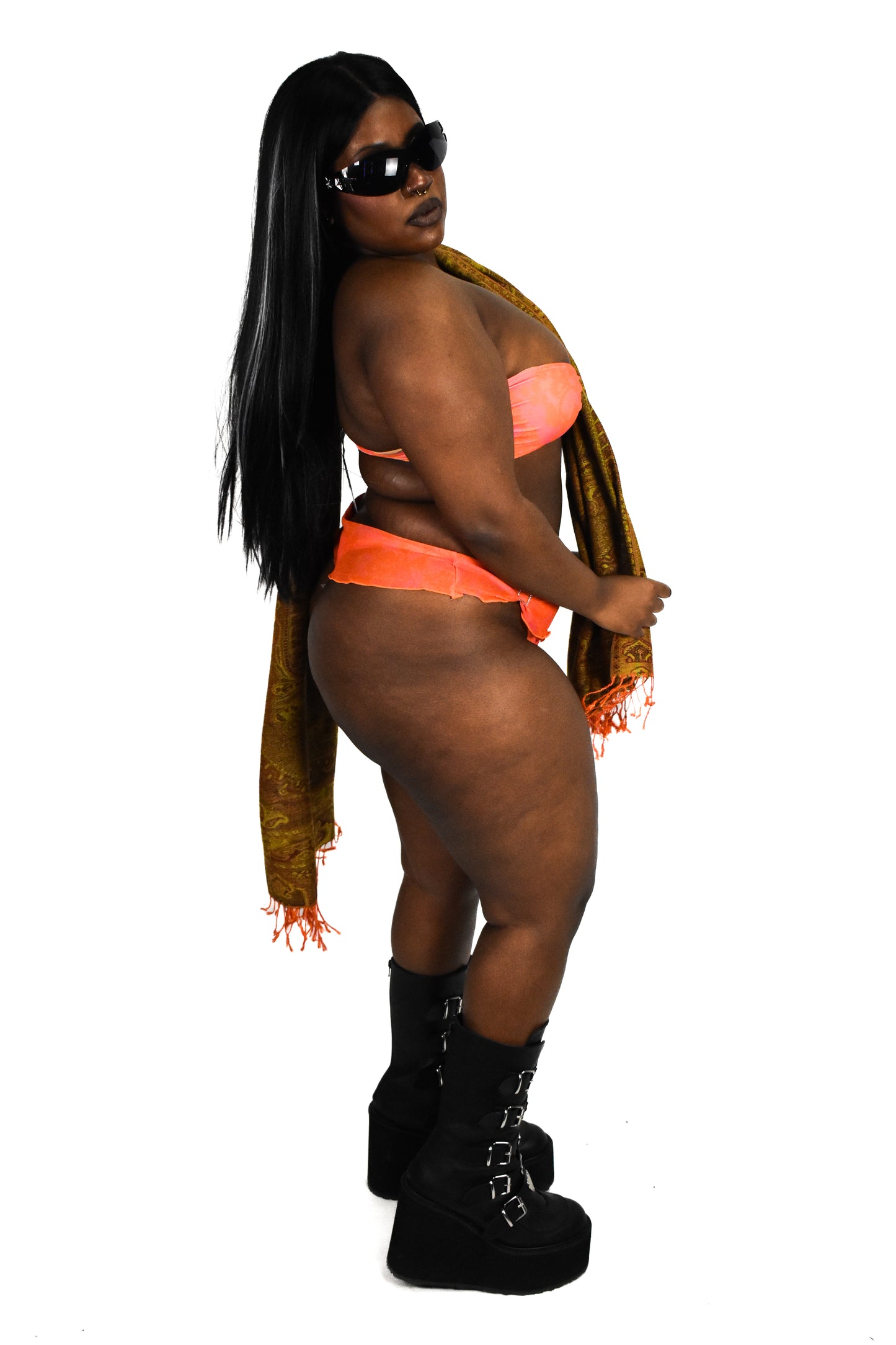 Two-piece set including tube top and matching bottoms with flutter mesh sides.