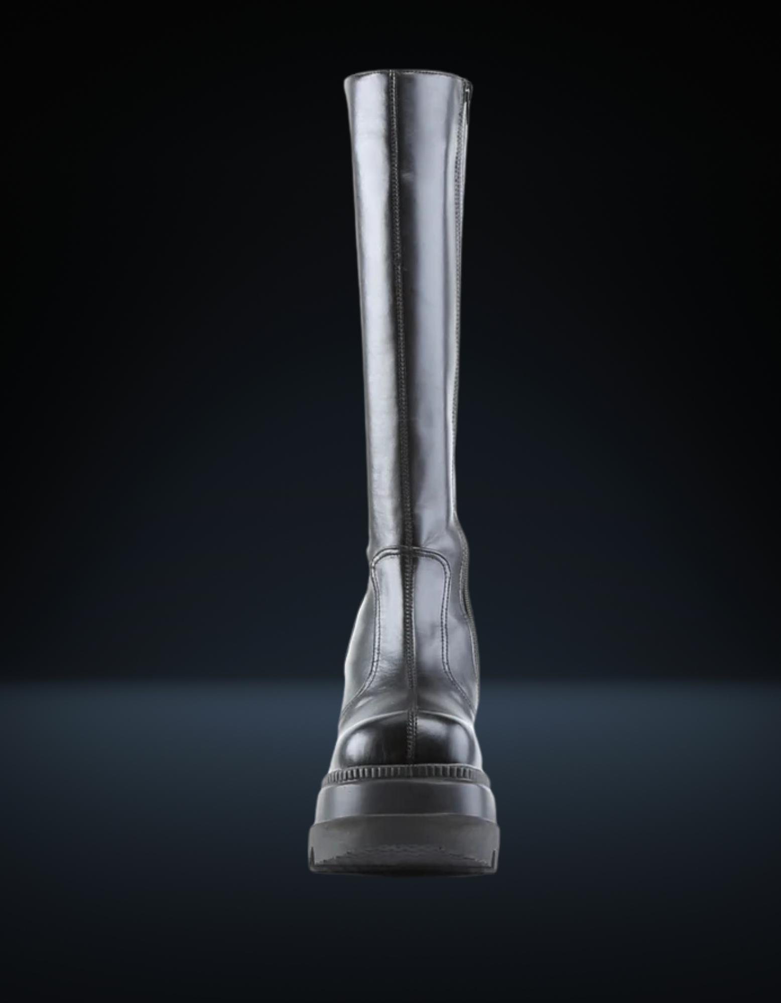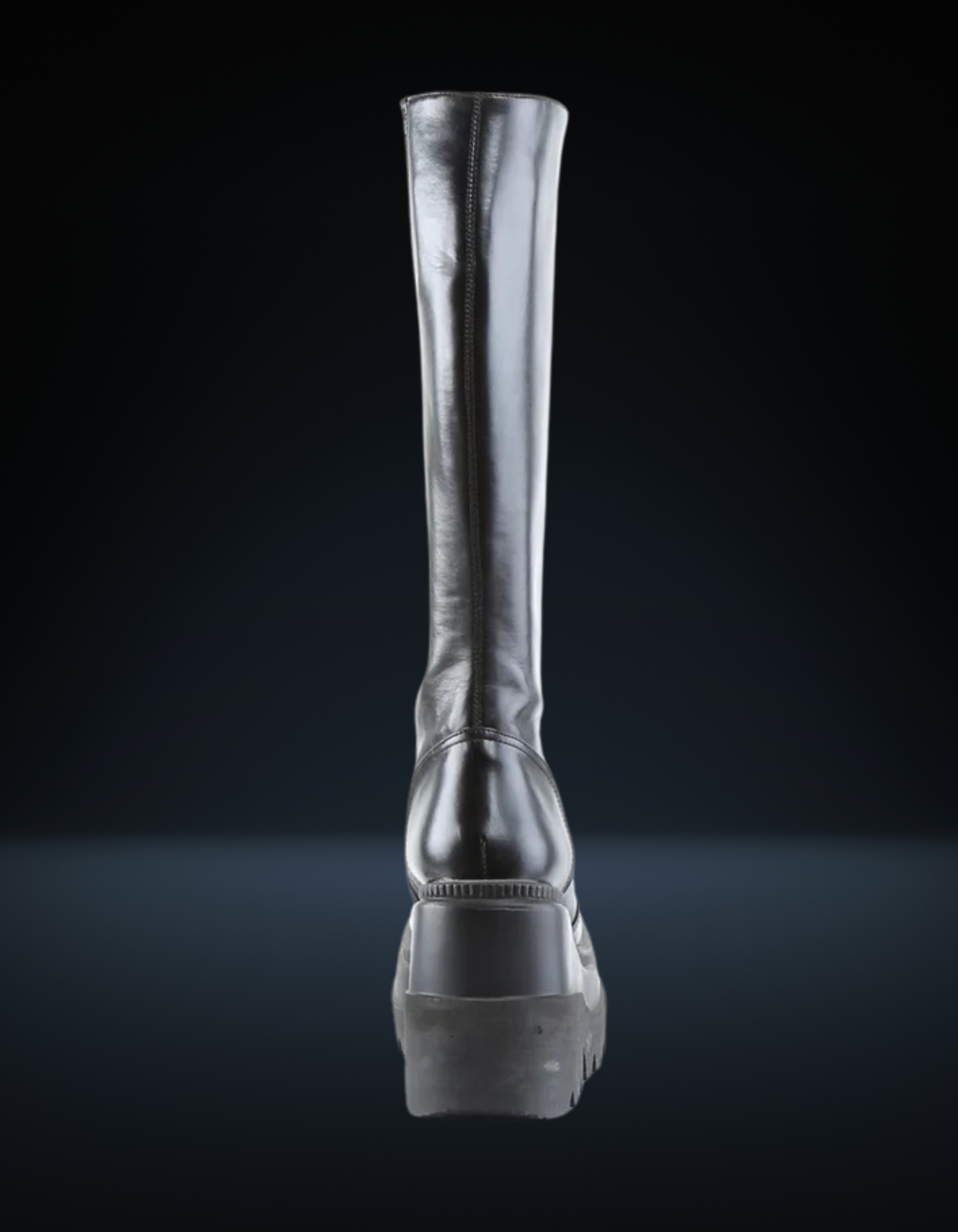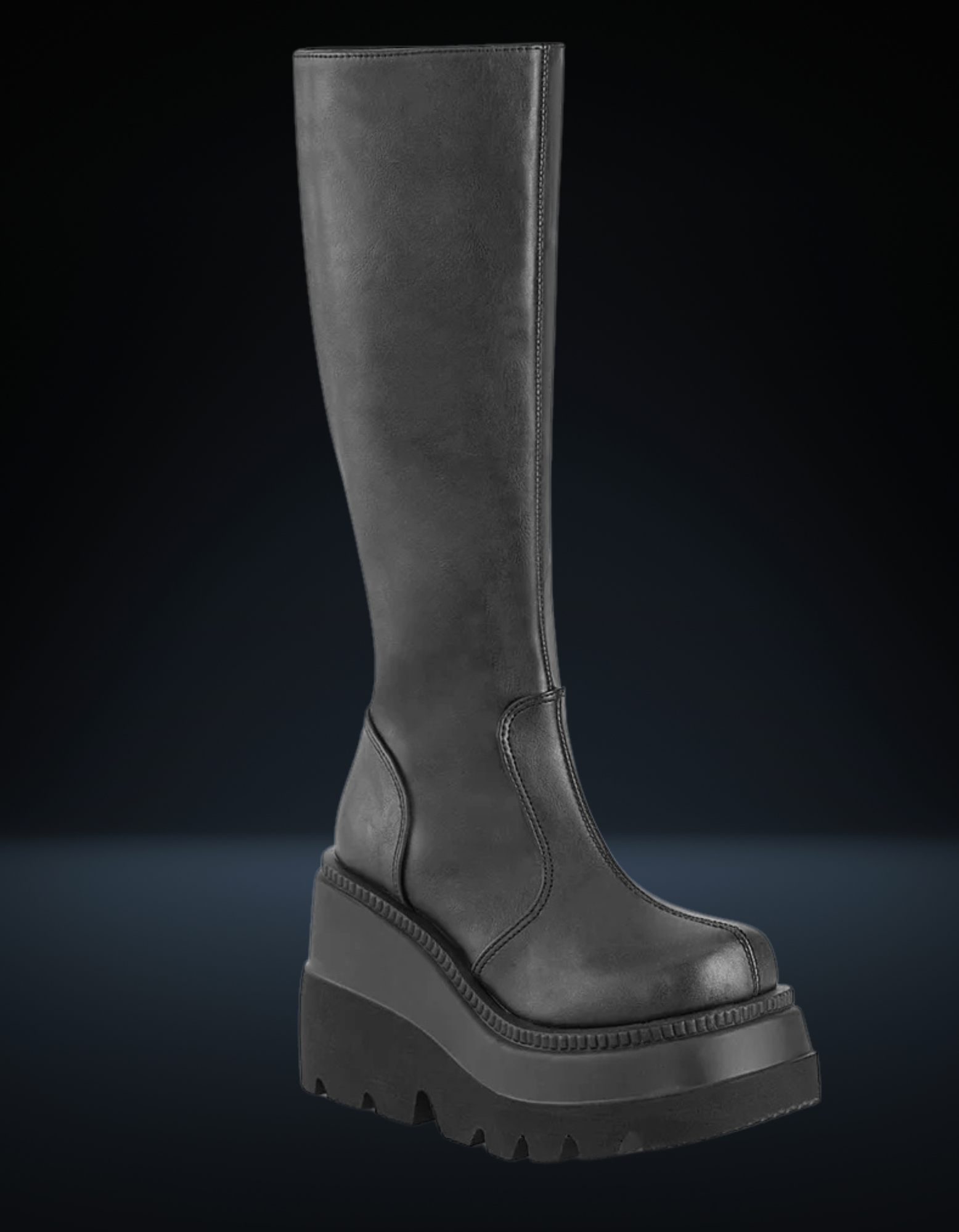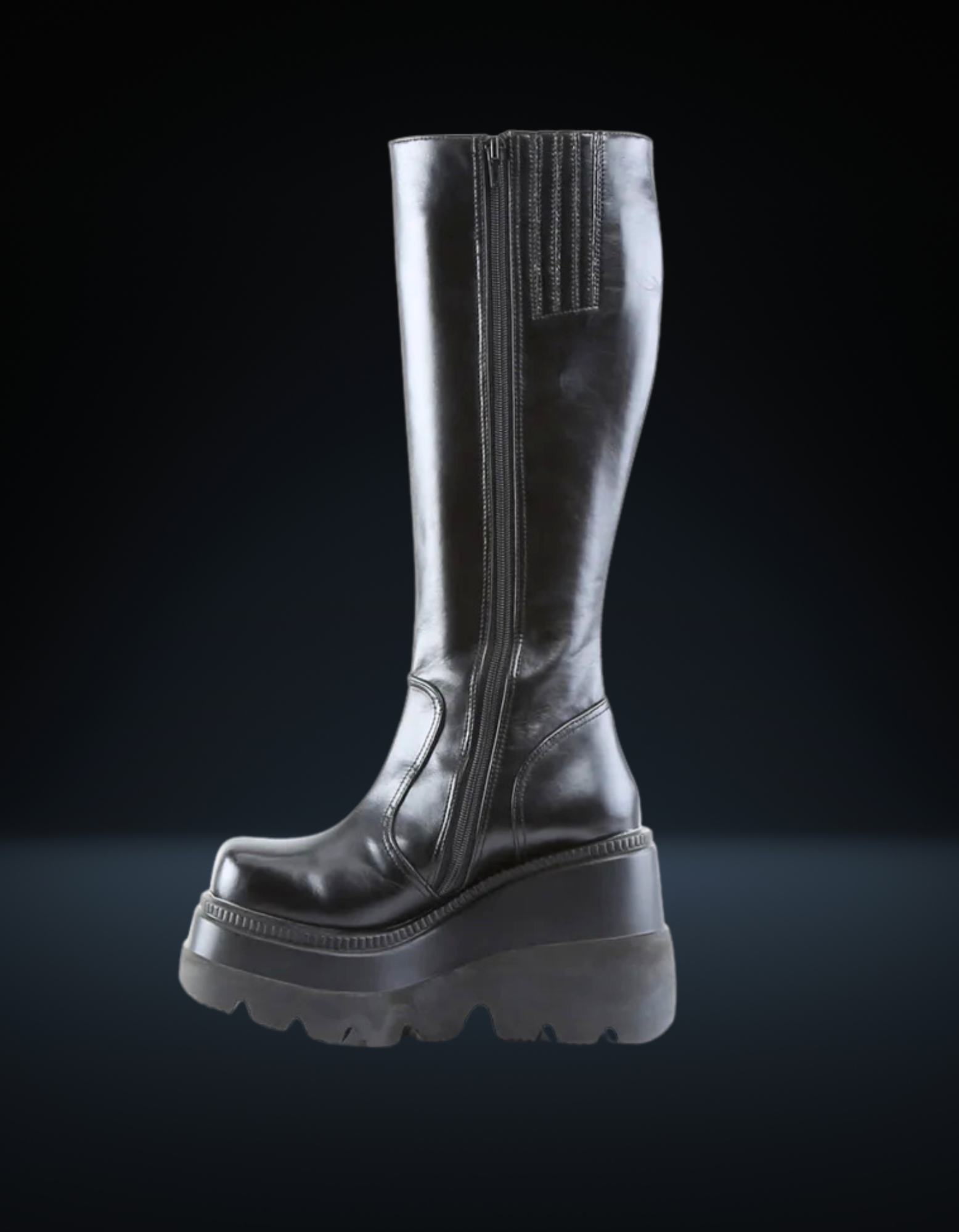 Shaker-100, the ultimate knee-high boot for alt baddies looking to make a statement. With a striking 4.5" stacked wedge platform, these boots will elevate any outfit to new heights. The full inner side zip closure allows for easy on and off, while the statement platform design adds a touch of drama to your wardrobe. Whether you're dressing up for a night at the goth club or adding a touch of edge to your everyday look, the Shaker-100 has got you covered. Get ready to turn heads with these striking, iconic, and versatile boots.