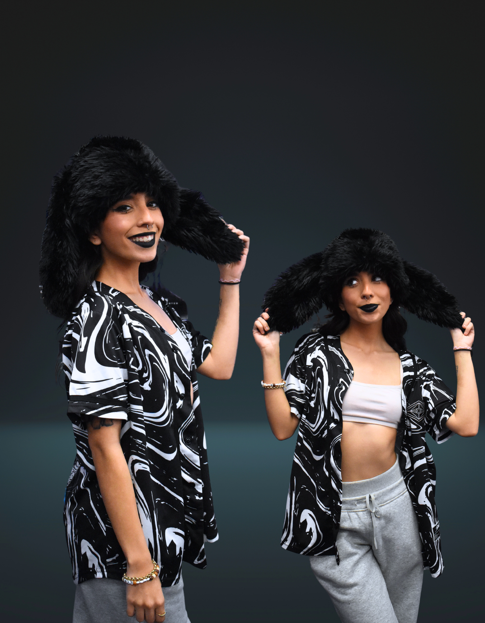 The iconic fuzzy buny hat. Adjustable strap inside for sizing.