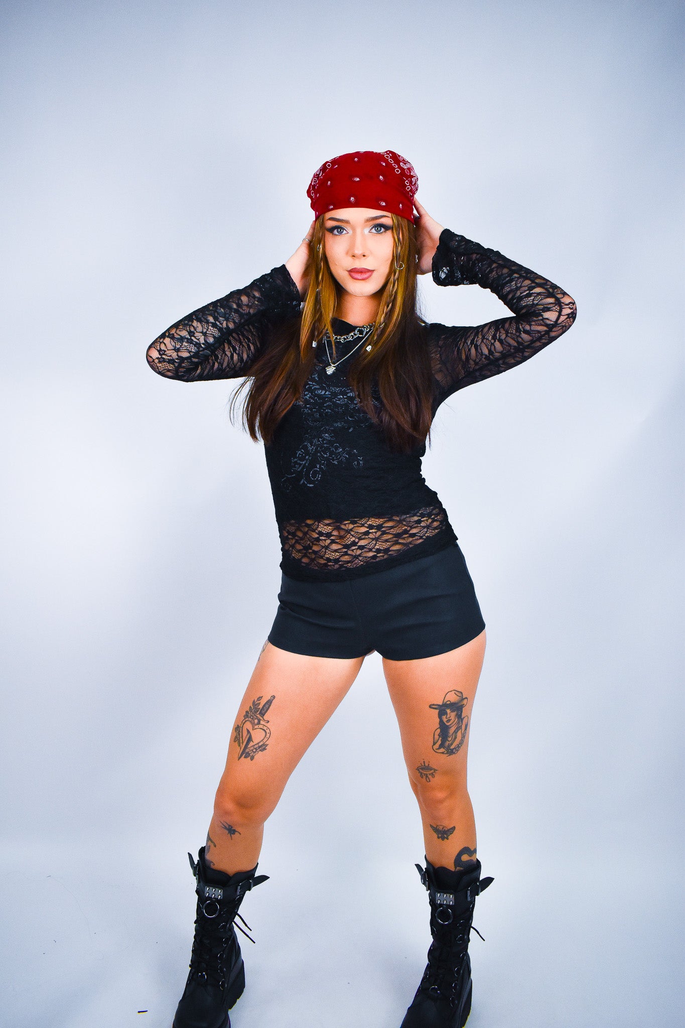 Long sleeve mesh sheer top with lace details. Tight and stretchy fit.