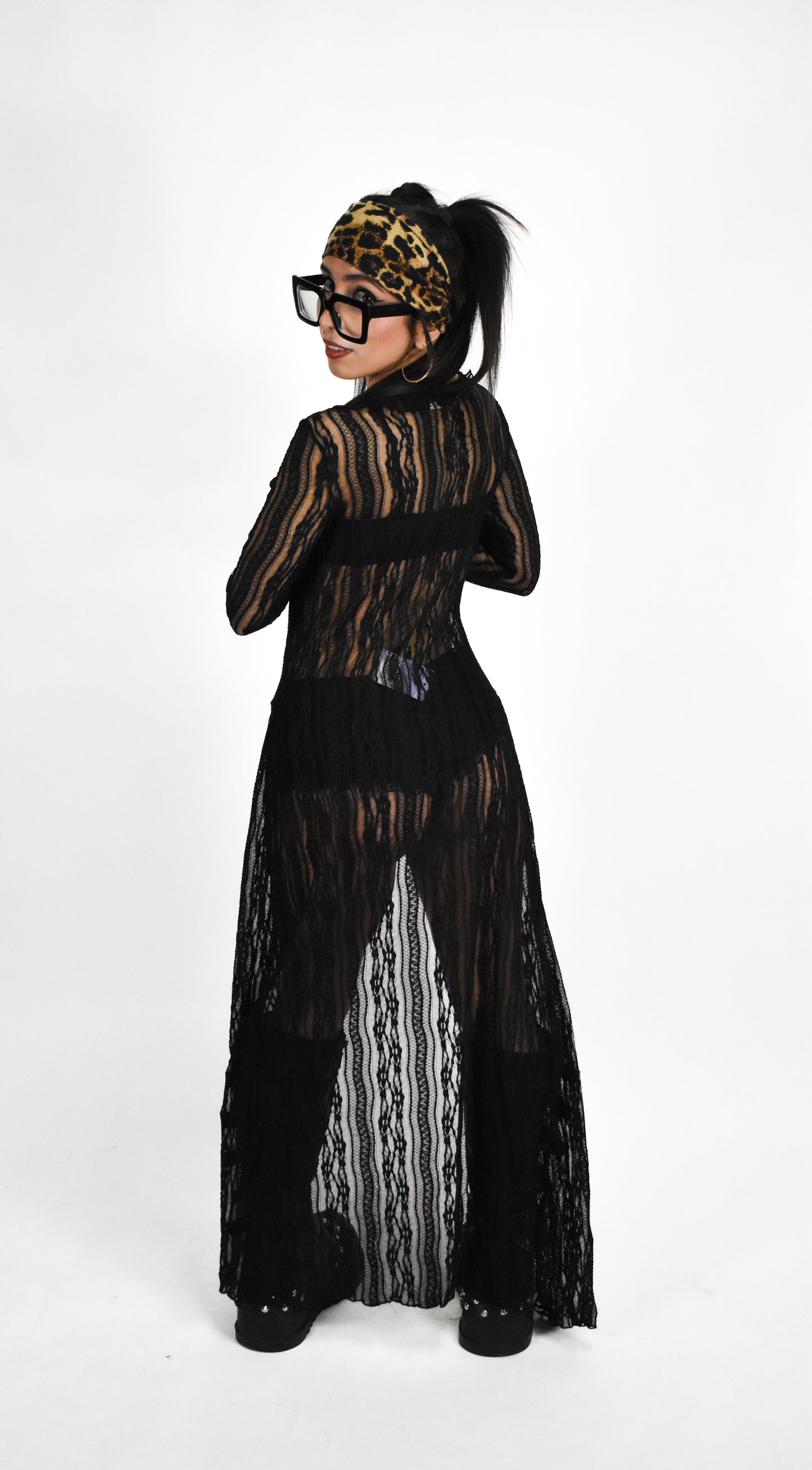 Festival duster top with lace long sleeves, a low scoop neckline and a ajustable tie in front. Ruffle trims and long fittemd semi flare sleeves. Sheer bondice.