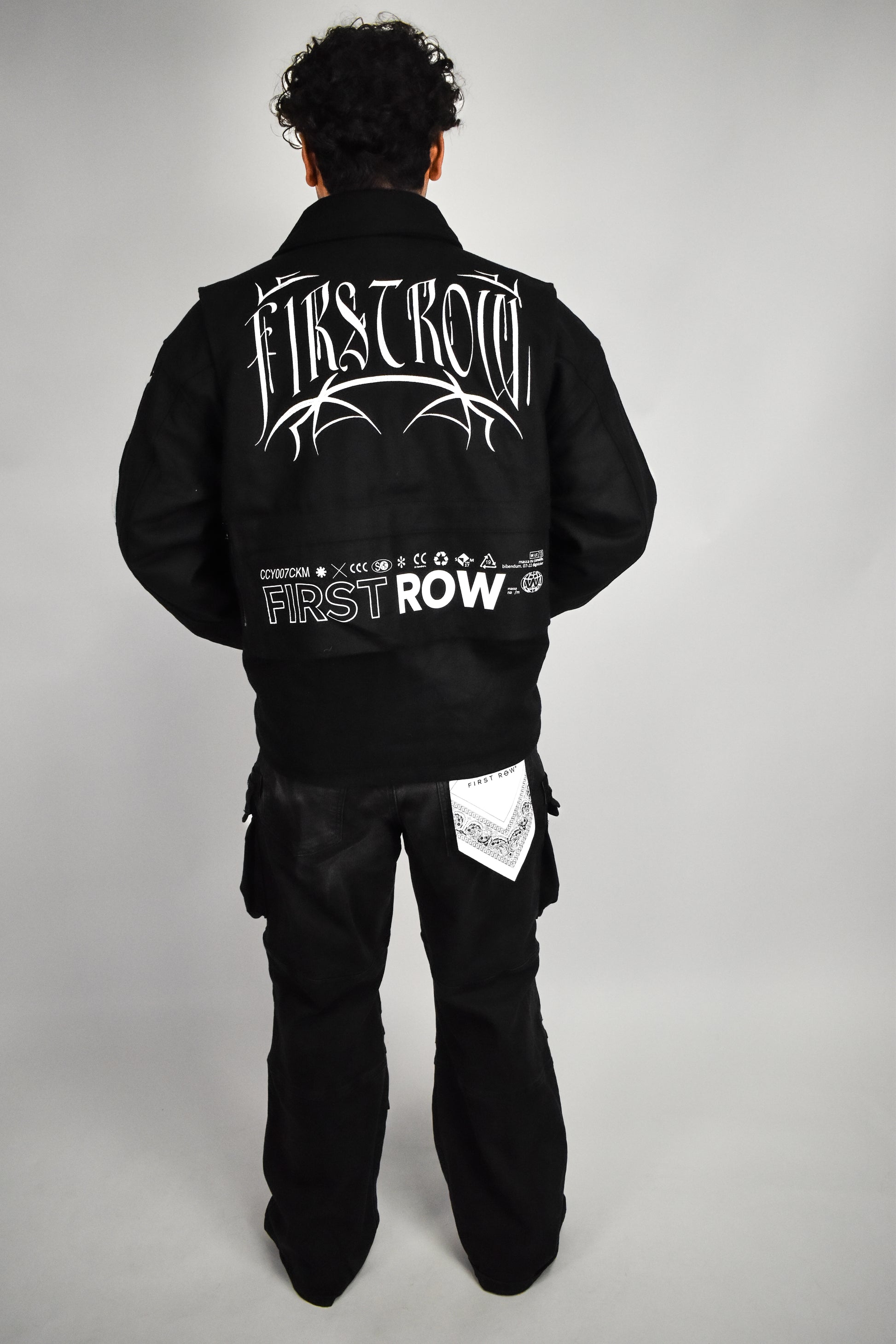 A wool utility jacket with a patch featuring a chest flap pocket, front welt pocket, back pocket with zip detail and snap button center front closure.